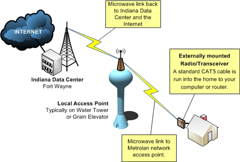 Metrolan high speed Internet from Indiana Data Center provides high speed Internet throughout the rural communities of Northeast Indiana. Service is delivered through a secure, point-to-point 802.11 microwave link between an installed radio/transceiver from your residence and an Indiana Data Center network access point. Service details include: